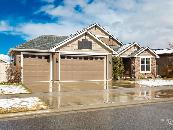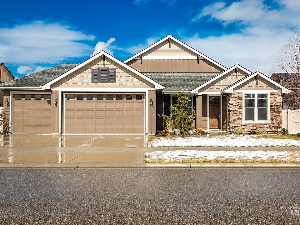 Welcome to your dream home! This charming single-level residence boasts 3 bedrooms, 2 bathrooms, and a spacious open floor plan with 9-foot ceilings, creating an inviting atmosphere perfect for both relaxation and entertainment. Enjoy breathtaking mountain views and extra privacy with no backyard neighbors. The insulated 3-car garage w/a pull thru door comes equipped with convenient hanging shelves, providing ample storage space for all your needs. Step outside to your oasis-like backyard featuring a tranquil water feature and a pergola-covered patio, ideal for al fresco dining or unwinding in the fresh air. The office, adorned with glass walls and doors, offers a serene workspace flooded with natural light. The primary suite has large windows with views, a spa-like bathroom with soaker tub, dual sink vanity and tiled shower. Indulge your culinary desires in the immaculate kitchen adorned with stained wood cabinets and luxurious quartz countertops. Don't miss the opportunity to make this exquisite home yours!