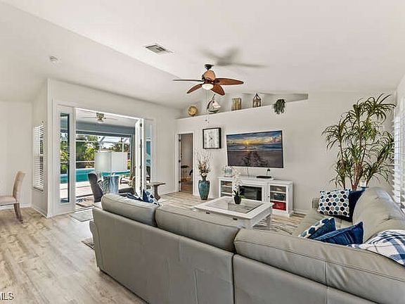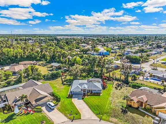 Meticulously Kept Pool Home Situated on a 1/2-Acre Pie-Shaped Lot in South Fort Myers! We proudly invite you to view this well-maintained property with thousands of dollars in improvements since 2021, PLUS an outstanding, private backyard with mature trees! Aesthetically pleasing & soothing ambiance with white-framed screen enclosures (entry & pool), white window & door frames, light interior paint colors, freshly painted lanai & pool deck! Great Room floorplan with vaulted ceilings, planter shelves, luxury vinyl flooring throughout (2021), plantation shutters (2021), double French doors with glass inserts and side panels to the lanai! Open & very functional kitchen featuring ample counter-space and breakfast bar, stainless steel appliances, including glass-top stove & dishwasher (2021), reverse osmosis sulfur guard (2024), pantry! In-home laundry room with LG Washer & Dryer, Upper Cabinets! Beautiful pool area with covered lanai, cage screens replaced in 2023, deck just painted and magnificent view of the backyard, a private oasis! Pool maintenance and new pump motor ((2025)! More updates include: Primary Bathroom Remodeled 2024, Primary Bedroom Closet System (2022), Shingle Roof (2019), New Air Conditioner (2024), Hot Water Heater (2021), Landscaping rocks & shrubs (2024), Irrigation System Updated (2022), Whole House Surge Protector (2025). So much more to see, this home is unique to the neighborhood - LOCATION, SPACE, PRIVACY!! No flooding or damage from recent storms. An added bonus, no flood insurance needed and no HOA fees.