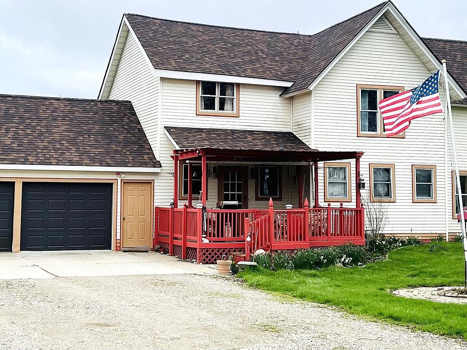 Beautiful Colonial 2 story home on partially wooded 10 acres with a bridge covering flowing creek that runs thru the property. Hang out in the heated pole barn during the chilly weather or on the deck in warmer times watching wild life in your back yard. This home offers 2136 sq ft, 5 bedroom, 2 bath, custom oak kitchen cabinets, a large family room and additional living room just thru the French doors that could be used as living space, home office or master bedroom. Lots of property for gardening with lots of potential for homesteading including harvesting from the fruit trees or pastures for livestock. 32 x 60 Pole barn has wood burning heat, enclosed work area for the hobbyist, or family gatherings. Within the barn there is additional loft storage and roll top doors. The options for this property are endless.