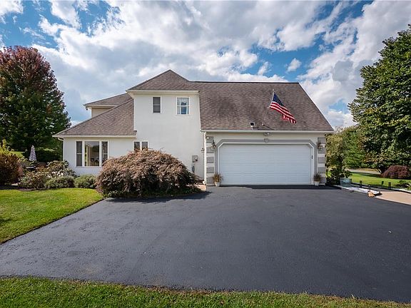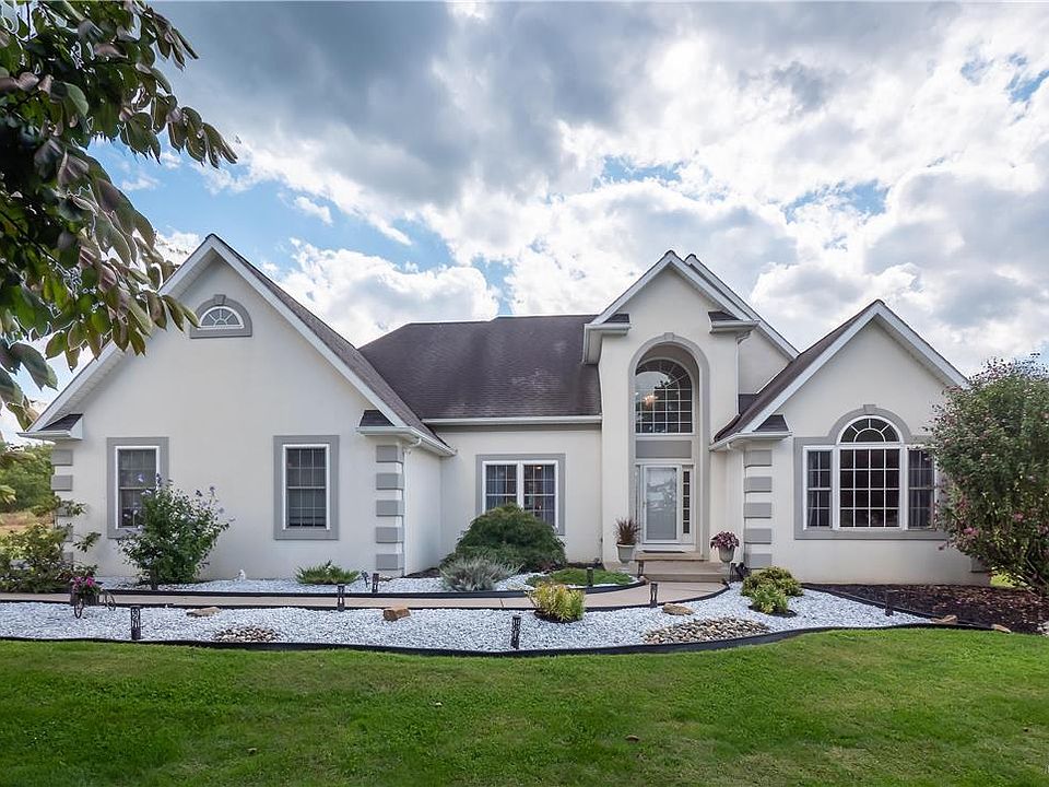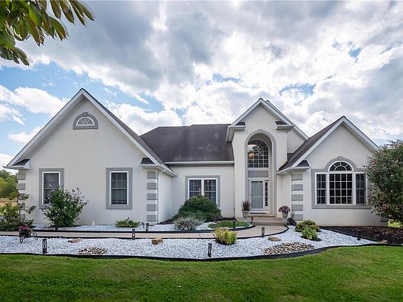 Welcome to this custom, contemporary home with open floor plan and cathedral ceilings situated on over an acre of land! This 3 bedroom, with the potential of a 4th bedroom, has been meticulously maintained and was freshly painted in Spring 2022. Upon entering you'll notice the gleaming Italian tile flooring in the foyer, hallway and kitchen. The living room features a fireplace, the dining room has inset carpet surrounded by tile. The eat-in kitchen will be any chef's delight with high end ss appliances, center island with built-in shelves and wine rack. From the kitchen, sliding doors lead to the patio and Koi pond. Walk to the back of the property and find a 2.5+ detached garage with its own 200amp service. This is any car hobbyist's dream or the perfect spot to set up your home gym. Enjoy views of open fields while sipping your morning coffee on the patio or if you're a baker, pick your own apples and bake a pie! The possibilities are endless with this one of a kind home!