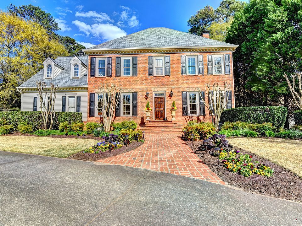 This unique home is a "Williamsburg Saltbox" architectural style - designed and built for a builder as his personal residence. This charming home features hardwood floors on the main, rich crown moulding, judges paneling in the living room with a wood burning fireplace, large formal dining room, study, cozy sun room, an updated kitchen with stainless appliances, and breakfast area with french doors leading to a large deck overlooking the private backyard and pool area. This stately executive home is ideally situated in Johns Creek. Don't miss this opportunity!