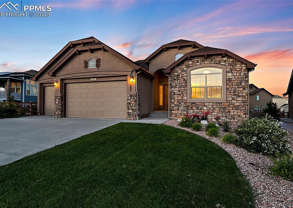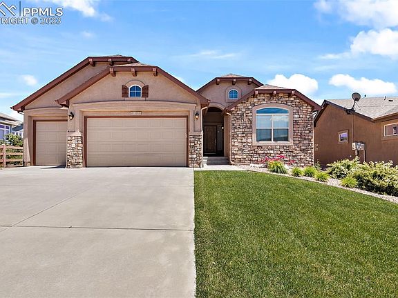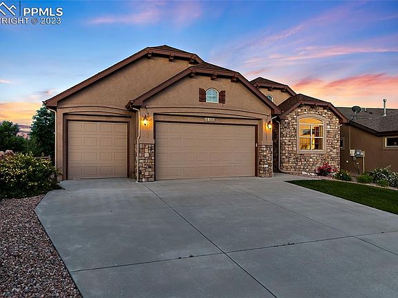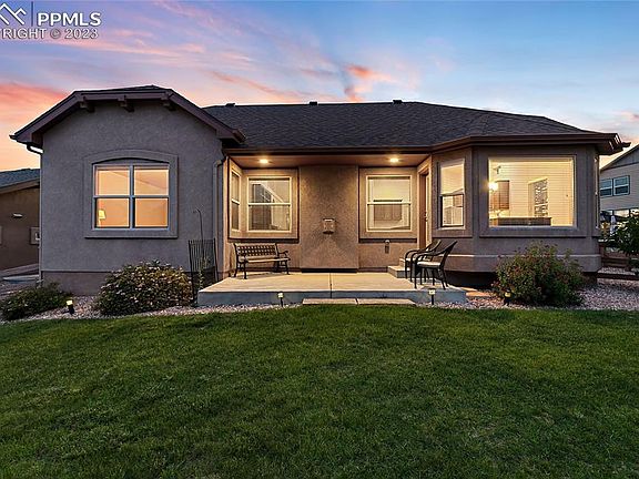 This 4 bed, 3 full bath, 3 car garage is turnkey and conveniently located in Wolf Ranch. Pride of ownership inside and out. The open floorplan makes for great entertaining and seamless transition from one area to the next. A sprawling granite island, stone fireplace, hardwood floors, and stainless steel appliances are just a few of the amazing touches in this home. This beautiful ranch style home offers an exceptional primary suite on the main level with dual vanities and a large walk-in shower. The front bedroom is across from a full bath makes a great space for a home office or a guest room. In the basement you will find a second en-suite and the fourth bedroom. The massive living space in the basement is ready for you to enjoy - fully finished and pre-plumbed for a wet bar. The front and backyard both have mature trees and lawn with beautiful flowers in abundance, and don't forget the views of Pikes Peak! This home is waiting for you!