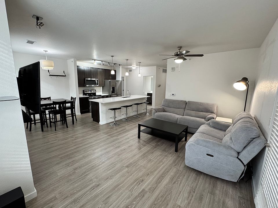 Located in the highly desirable area and complex known as Prairie Walk, which is immediately adjacent to Cherry Creek Trail. This stunning 2 bedroom, 2 bathroom condo home is like new (built in 2019) and is in pristine condition. Modern design and fixtures. Partially furnished (or can be rented empty). Functional, open floor plan. COMES WITH 1 CAR DETACHED ENCLOSED GARAGE (with high amp E car charger). Modern dream kitchen is ideal for entertaining. Complete with quartz countertops, massive kitchen island with 4 chairs, an abundance of storage, kitchen pantry, stainless steel appliances. Dining comes with 4 person table and chairs. Living room comes with gas fireplace and flat screen TV. A spacious master bedroom with bed and extra large walk-in closet. Master bath is en suite and has linen closet, dual vanity sinks and highly upgraded ($15K) walk-in rain shower. Second bedroom has walk-in closet and bathroom down hallway. Dual covered patios, with table and 2 chairs and the other with Weber BBQ Grill and Electric Smoker. Community amenities galore, including pool, hot tub, massive greens cape, park and immediately adjacent to Cherry Creek Trail, which heading north does to downtown Denver, and south to Castlewood Canyon State Park. Amenities also include fully equipped gym, business center and sand volleyball. Extra large capacity washer/dryer. Trash, water, sewage and snow removal included. No smoking inside unit or patio. Tenant pays for cable, gas, electric and internet. 12 month lease. Gas, electric, internet are renter's responsibility. No smoking of any kind inside unit nor on the patio.