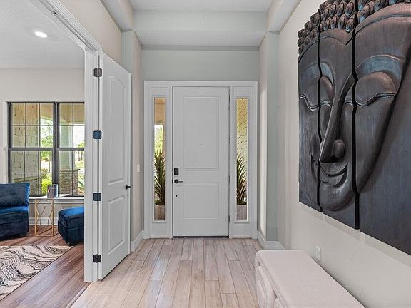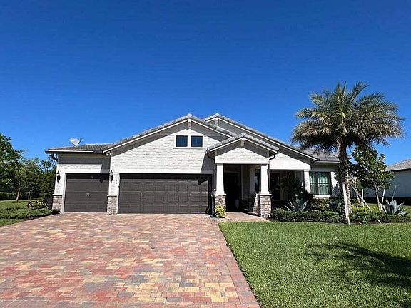 OWNER EXTREMELY MOTIVATED/BELOW MARKET FOR LARGEST MODEL! Home shows meticously and on 1/3 acre! Upgrades galore. 4 bedrooms/open Florida living style. 5th rm has murphy bed system. Coffered ceilings. Living and dining rooms feature 'no corner doors' leading out to the spacious screened lanai. Extra footage added to 3 car garage. Chef's kitchen features, spacious pantry with custom built ins, gas cooktop, huge island with kitchen seating, and high end SS appliances. Expansive primary bedroom features two elaborate walk-in closets. Split bedroom floorplan allows privacy for all. This home is not to be missed! Two Tesla charging stations. NEWLY FENCED YARD SINCE PHOTOS. Sandhill Crane golf course is adjacent to the home for golf & dining. Great benefit without joining a Club membership!