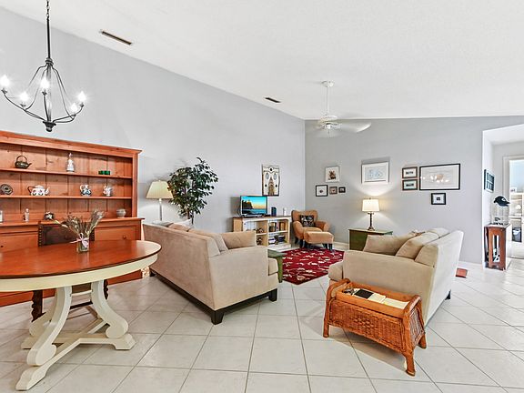 This immaculate villa is a true gem, exuding model-like perfection in a peaceful, private community. Designed with a desirable split floor plan, this residence features soaring 12-foot vaulted ceilings and tile flooring throughout the main living areas, creating an open and airy ambiance. The galley-style kitchen offers convenient access to the front patio, while accordion shutters provide added security and peace of mind. Both master suites offer comfort and privacy, with carpeted bedrooms that provide a cozy retreat. The dining area is enhanced by a stylish mirrored wall, adding depth and elegance to the space. Each room opens onto an expansive 700 sq. ft. screened patio, the perfect spot to unwind and enjoy the ideal northeast exposure. A dedicated storage room adds extra convenience.