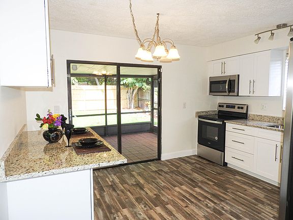 Fully fenced, private backyard in Palm Beach Gardens. Recently remodeled with white soft-close shaker cabinets, granite counters, glass display cabinet plus an extra storage cabinet with granite breakfast bar. Most appliances are new, water heater 2020, A/C 2016. Luxury vinyl floors throughout, new paint inside and out, no popcorn with knock-down ceilings. Master bedroom has 2 closets, decorative fan/light, and attached bath with new floors, new tub/shower and vanity. Second bedroom has closet and fan/light, large windows brings in natural light. Extra half bath for guests. Inside laundry with extra storage. Large screened and covered lanai with tile floor and shed stays. Room for 4 cars in driveway. Great opportunity to live in an upgraded home in a top-rated school district with NO HOA.