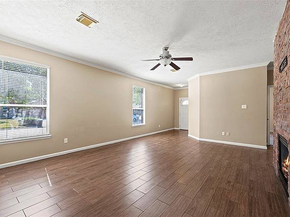 Welcome to this charming 3 bedroom, 2 bath, single-story home, perfectly situated on a spacious corner lot in a quiet cul-de-sac. As you enter, you’re greeted by a lovely porch, ideal for morning coffee or evening relaxation. The open living and kitchen area features beautiful wood-like tile flooring, creating a warm and inviting atmosphere. The sleek accent wall with a gas log fireplace and TV mount adds a modern touch to the space, perfect for cozy gatherings. The kitchen boasts granite countertops, stainless steel appliances, and an abundance of cabinet and countertop space. An in-house utility room off the kitchen adds convenience, and the included refrigerator makes moving in a breeze. The secondary bedrooms are generously sized, offering plenty of space for family or guests. The primary bath is features double sinks, enhancing your morning routine. Step outside to the covered back patio, where you can enjoy outdoor entertaining or simply unwind.
