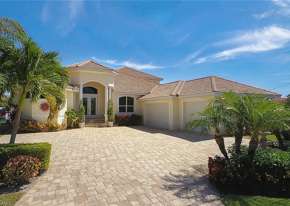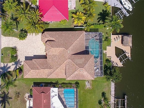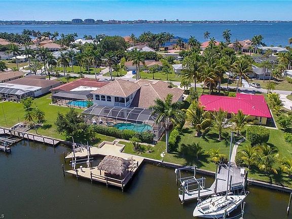 This is a luxurious pool home in the Yacht Club section of the Cape and is being sold TURNKEY. Walk to the Yacht Club beach and the Boat House! This house features direct gulf access with a boat dock and a 13,000 pound lift, jet ski lift, and large tiki hut with ceiling fan, overlooking intersecting canals. The large lanai is perfect for entertaining with the electric heated pool and spa, in-pool bar stools and swim up bar, and an outdoor kitchen. All four bedrooms have their own bathroom, making this the perfect vacation rental for large families and couples traveling together. The 1st floor master suite has a luxury bath including walk-around shower, and a centered garden tub. There is a second master suite upstairs with king sized bed, sleeper sofa with air adjustable mattress, full bath and balcony. The fully equipped kitchen features a large breakfast bar, a center island, granite counter tops and newer stainless appliances. The house has a 3 car garage and a circular driveway.