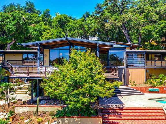 Perfect Stay at Home Mid-Century Modern Architectural Masterpiece. This 1957 Buff, Straub and Hensman home has been featured in numerous tv shows, books and architectural tours. Originally built for the Frank Family (Lawry's Foods) and owned by Beck, with over 5000 square feet, this post & beam home is built into the natural contours of the expansive 1-acre gated property to create the ultimate tree house experience while giving you maximum privacy. The main living areas and bedrooms open onto decks and patios creating the indoor/outdoor California experience. The glass walled living room opens to decks overlooking the pool and the Arroyo beyond. Enjoy the views over the Arroyo of the San Gabriel Mountains. The master suite is truly a retreat. This unique home boasts 5 bedrooms, 5 baths, dining room, family room, den, media room, project room, gym and a loft playroom. The kitchen is a cooks dream. Large closets, a workshop space and a very large basement provide ample storage. Located in the prestigious San Rafael Estate Neighborhood of Pasadena, this house is the perfect place to entertain friends and family for generations to come. Listed on the National Register of Historic Places.