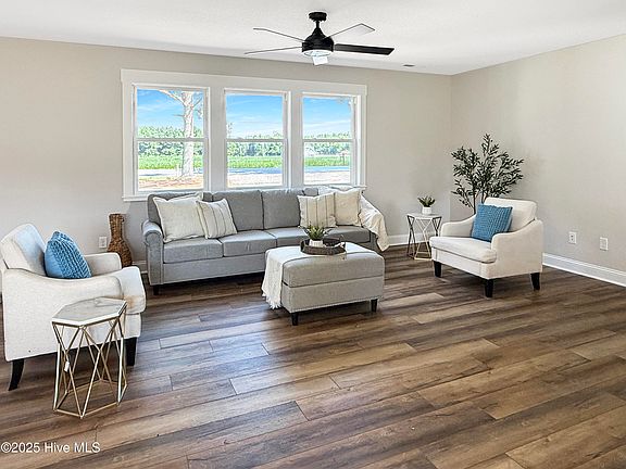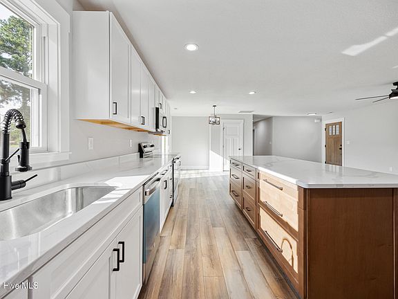 This one isn't just updated—it was taken down to the studs and rebuilt. Brand new includes: sheetrock, electrical, plumbing, HVAC, insulation, vinyl siding, windows, doors (including the garage door), tankless water heater, gutters, landscaping, all fixtures and more. It's as close to new construction as you can get without building from scratch. Set on 1.78 acres just 5 miles from downtown Edenton, the property offers open land dotted with mature trees, plus a brand-new back deck perfect for enjoying the beautiful countryside sunsets. Inside, the floor plan is wide open with great flow, and the kitchen island with bar seating is the heart of the home—ideal for everyday life or entertaining. The kitchen includes Waypoint soft-close cabinetry, Terra Luna quartz countertops, GE stainless appliances, and Delta fixtures.