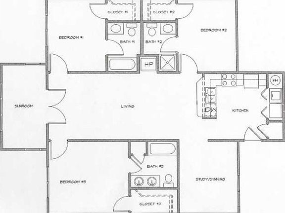 1,400 sq ft living area, sun-room with French doors, separate dining room, carpeted and/or hardwood floors. Each room has a ceiling fan, walk-in closet, and private bath/shower.