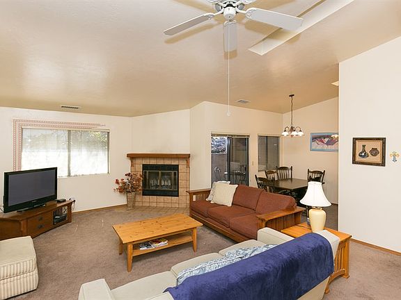 Perfectly located home in the pines and minutes from the courthouse square. 2 bedroom + den/office (w/ closet) easily possible 3rd bedroom, 2 bath home. Clean, cozy home with wood burning fireplace, private rear patio, open floorplan. Lightly lived in, one level living, single car garage with additional driveway parking. These zero maintenance homes RARELY come on the market. Home has newer roof, exterior paint.