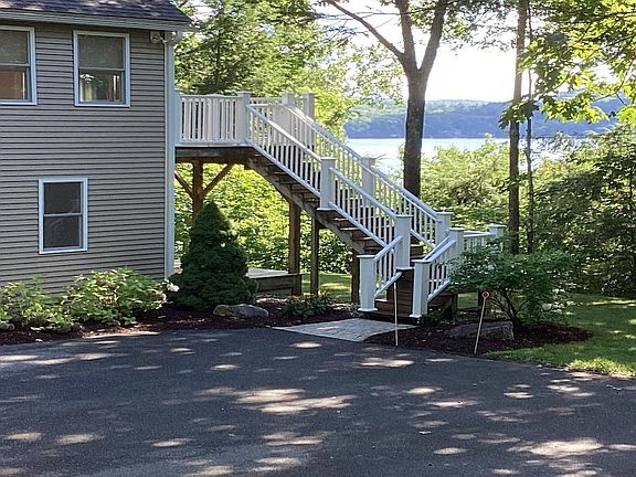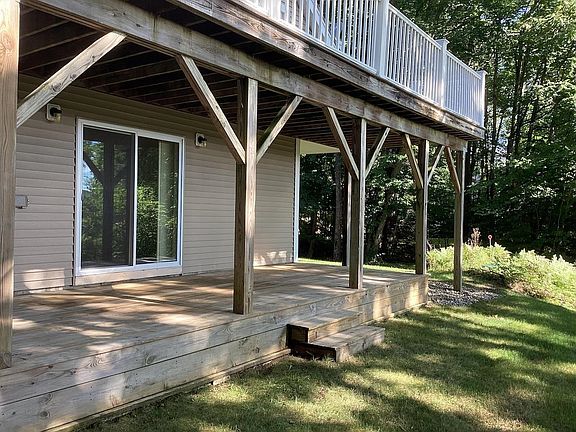 A home with much to offer. View of the lake, deeded lake access across the street to swim off the dock with room for your boat, quiet setting with 2.97 acres, open concept, spit bedroom plan to name a few features. Enter the home through the one car garage with utility room or covered porch from the paved driveway. First floor has an entry closet, two bedrooms with large closets, open office or sitting area, tiled bath with walk in shower & closet, utility closet and additional storage under the stairs. The slider leads you out to the covered 6 x 24 foot private porch for great extended living. The open staircase leads you to the second floor where you are greeted with the lake view from the bank of windows with a slider to the 6' x 24' deck from the open concept dining - living area. The kitchen is open with an island/bar area, storage closet and walk in pantry with shelving and counter space. The primary suite has a tiled full bathroom with linen closet and walk in closet with pocket door and built in storage area. Off the living area there is a 1/2 bath along with a laundry room and hall to the back private 4 x 24 foot deck. The Jotul GF 400 propane stove in the living area adds additional comfort. The home was built in 1984 and in 2015 the home was taken down to studs and concrete floor then rebuilt with new electrical, plumbing, insulation, sheetrock, windows, doors, floors, decks and fixtures. There is an 8 x 48 canopy area along the side that provides several uses.