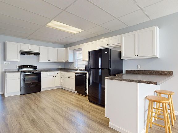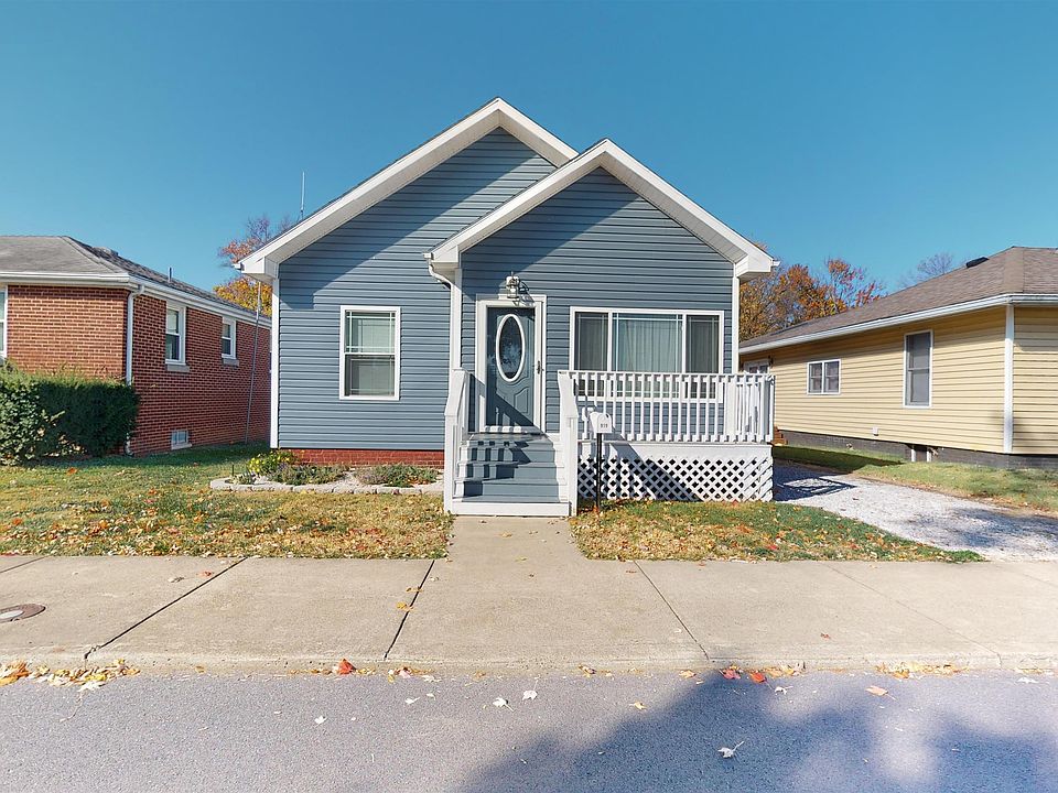 Cute as a button and totally remodeled home located directly across from City Lake. The open floor plan is so welcoming as you come into the light-filled living room featuring a large front picture window with side sliders. Be sure to check out the 3D tour! Multiple windows throughout the main living area bring the space to life. Easy to maintain wood plank flooring in the living room, kitchen, bath and laundry. The eat-in kitchen offers a breakfast bar, nice white cabinetry, a large pantry closet, and all appliances including a built-in dishwasher, refrigerator, stove and microwave. There is a separate laundry room behind the kitchen. The main bedroom has a double door closet and bath access. Overhead light fixtures in both bedrooms. All white doors and trim throughout. Cute, remodeled full bath has a tub/shower, white vanity and chrome fixtures. The entryway deck will be so fun to decorate for the different seasons, and the front storm door adds personality and a little extra security. Rounding out this great home is a full unfinished basement, fully fenced back yard, and large outbuilding to fulfill your storage needs. Improvements include replacement windows with prairie style grids, new HVAC, doors, wiring, and plumbing per previous owner. This home qualifies for USDA 100% financing. Don't miss seeing this great property!