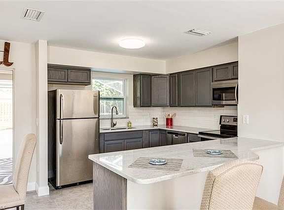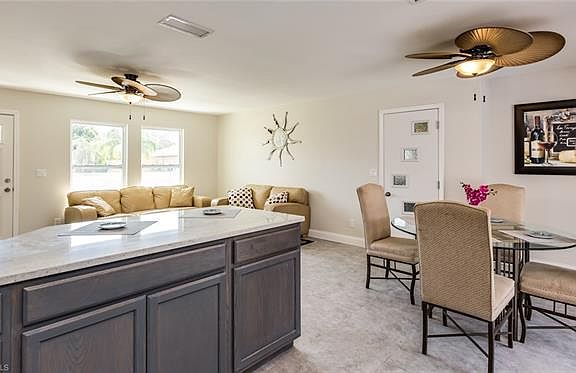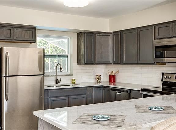 A beautifully remodeled 3/2 pool home in SE Cape Coral! Brand new kitchen with solid wood cabinetry, marble countertops, and stainless steel appliances. New tile floors and oversized baseboards throughout. The interior walls have been freshly painted with the latest designer colors. The refreshing pool has been renovated. Enjoy the large private backyard from your screened lanai which has recently been rescreened. The exterior of the home has been painted and the landscaping updated. Most of the windows have been replaced with impact windows. Both bathrooms have new tile, vanities, tubs and fixtures. Nothing left to do here but move-in and enjoy! Furnishings shown available. Great location with easy access to Veterans Hwy or Cape Coral Parkway. Close to restaurants, shopping, and downtown. A great price for a completely remodeled pool home. Schedule your private showing today!