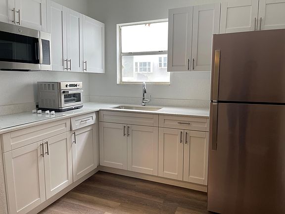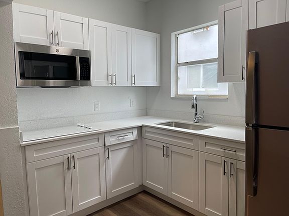Newly renovated ground-floor apartment in a serene boutique building! Enjoy the elegance of faux wood flooring, a brand-new kitchen featuring a sleek glass cooktop, and upgraded impact windows. The modern bathroom adds to the charm. This spacious 2-bedroom, 1-bath unit boasts generously sized rooms with ample closet space. Residents benefit from exclusive parking and convenient shared laundry facilities on the first floor. New impact windows and split ACs!