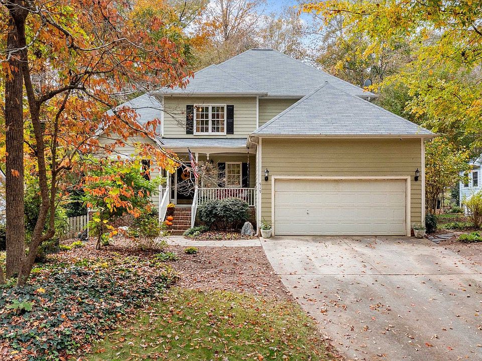Established neighborhood close to E. Carroll Joyner Park and trails. Convenient to tons of shopping. The 2-story family room with fireplace is breathtaking. Dining room is currently used as 2nd living area. Sunny breakfast nook. 1st floor owners' suite with garden tub, tile shower & walk in closet. Hardwood floors. Main level laundry room. 3 bedrooms and full bath up plus duck-in storage & pull down stairs. Fenced yard with plenty of trees, basketball hoop & "court", waterfall & swing set. New roof in 2021. Low HOA dues include pool, tennis & basketball courts.Neighborhood sidewalks. Carpet needs replacing (priced accordingly).