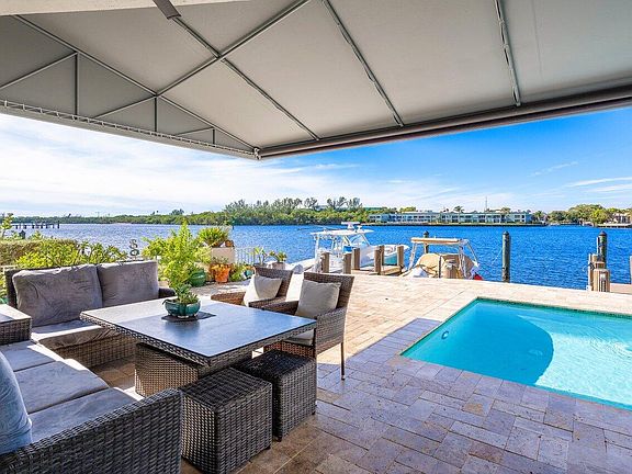 Outstanding, waterfront four bedroom townhome (end unit) with soaring ceilings, private pool and 2 car garage, assigned boat slip and deeded beach access. Breathtaking panoramic views spanning 3/4 mile with unobstructed sightlines of the expansive waterway from every room. Enjoy these vistas of the wide section of the intracoastal through generously-sized solar shield impact glass windows. Totally open gourmet kitchen that overlooks the family room, deck, private pool, boat dock and that amazing view. Huge waterfront primary suite with massive closet. Completely renovated primary bath features a high end jacuzzi tub, spa-like shower, custom cabinets, granite countertops and beautiful intracoastal views. Intimate townhome community walking distance to deeded beach access. Just a short walk to the ocean. single paned front door, new energy efficient foam insulation installed in attic and exterior painted all in 2023.