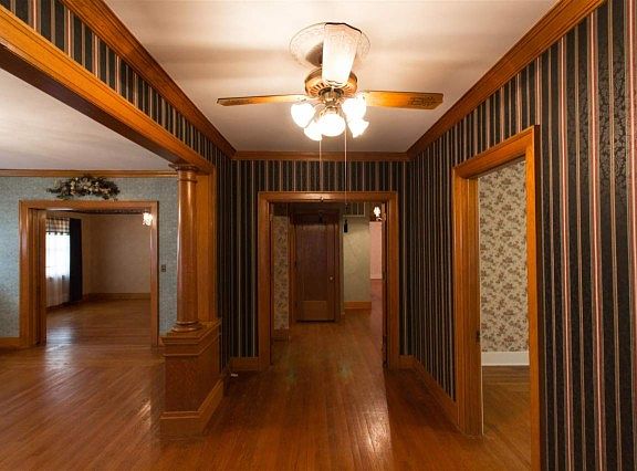 This beautiful riverside bungalow is a craftsman s dream. The main floor contains nine foot ceilings throughout, crown moldings and five inch baseboards. The charm is continued throughout the home with original cabinets with plenty of storage and the original crystal and silver chandeliers. The hardwood floors run throughout the living and dining areas and are separated with pocket doors. The bedrooms on the main floor contain hard wood flooring and are accompanied by full bath with Jacuzzi soaker tub. The eat-in kitchen is updated with a range and hood, island (saddle stools included), new garbage disposal, side-by-side refrigerator and freezer, and electric/convection glass top range with built in microwave above. The granite countertops are accentuated with a 14 inch backsplash, under cabinet lighting and a double enamel farm sink with built in wine rack. The second hallway has double French doors with enclosed staircase and large coat closet. The stairway leads to a large, and open master suite with plenty of natural light, bathroom with standing shower and great closet with light! In addition to central heat and air, a supplementary window unit remains for spot-on comfort. The large and open 1,700 square foot basement is perfect for a storm shelter with concrete ceilings and exterior entrance. The downstairs also houses the laundry area, brand new 40 gallon water heater and a built in work bench. The detached, oversized 1 car garage with opener can hold more storage if needed. Enjoy the beautiful neighborhood with mature trees by relaxing on the front porch in the swing or out back on the screened in covered porch.