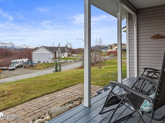 Enjoy the beautiful Palmer mountain and Aurora views from the comfort of your front porch. This beautiful custom home offers a large kitchen w/walk in pantry, granite counter tops, beautiful cabinets, and newer appliances. Master bedroom has large walk in closet w/jetted tub. This home has new carpet throughout finished last week, new blinds in all rooms, light fixtures w/fans, new toilets,new water heater, epoxy flooring in garage as well as new stairs going from garage to kitchen, updated firepit, shed, and a partially fenced yard for dogs or kids to enjoy! Great location for commuting, walking distance to Colony schools, and just 19 minutes from Skeetawk Ski Area at Hatcher Pass.