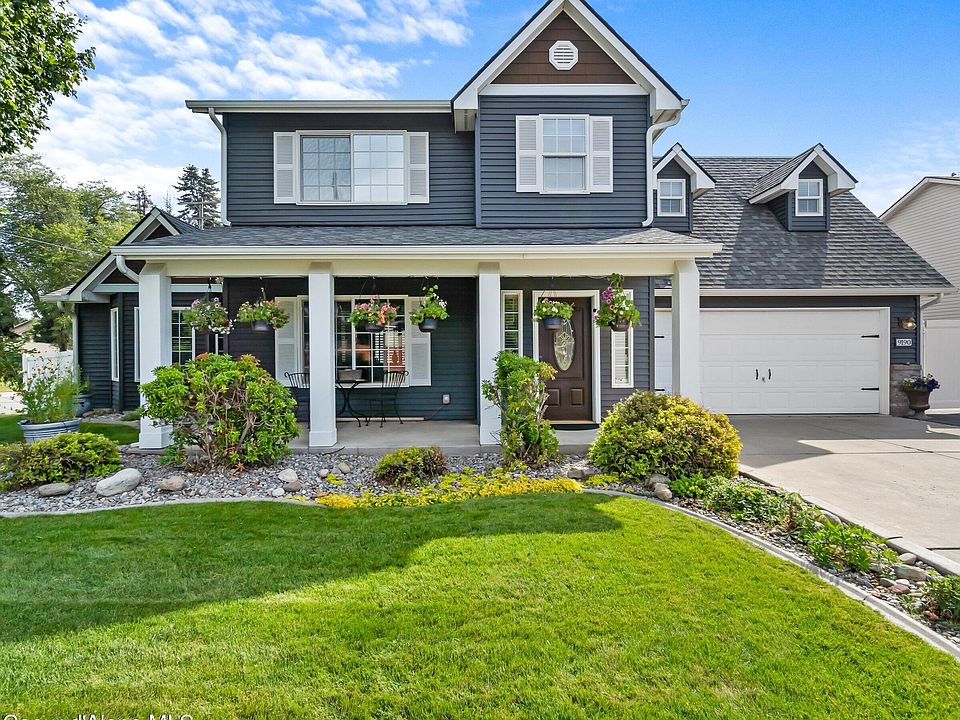 Beautifully updated two-level Hayden home on a corner lot, ready for new owners! Step inside to a light and bright open-concept floorplan with modern LVP flooring, vaulted ceilings, two spacious living areas, and a gourmet kitchen with stainless steel appliances and granite counters. Head upstairs to 4 spacious bedrooms, including the relaxing primary suite with a private bathroom boasting a gorgeous tile shower. Updated light fixtures, ceiling fans, interior paint, and vinyl siding. Sprinkler system front and back, charming covered front porch, fully-fenced backyard with large patio, hot tub, beautiful landscaping, fruit trees, and a detached 16x20 shop with garage door, work bench, loft area, and built-in shelving. Attached 2-car garage, paved RV parking area, and located near downtown Hayden and Hayden Lake. Welcome Home!
