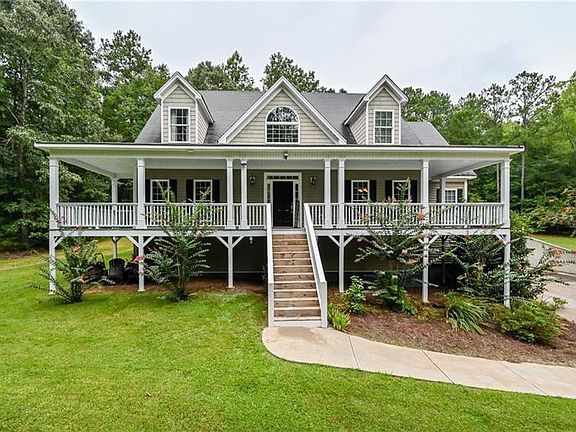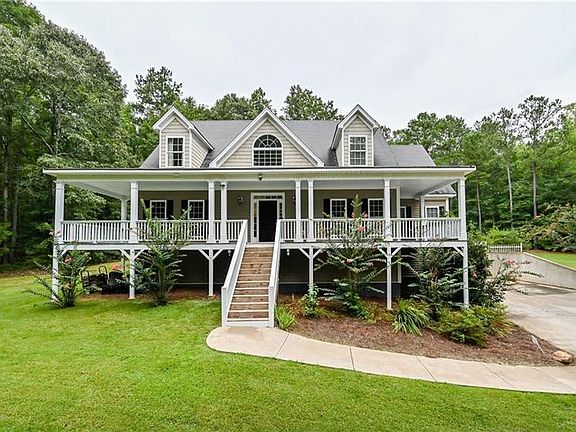 Beautiful wooded estate on 9.76 acres 45 min to downtown. Enjoy the quiet of lovely custom homes on cul-de-sac w/winding drive & gate. You're greeted by a large wrap around porch perfect to enjoy views. Sunlit floor plan. Large chef's kitchen w/wall oven, maple cabinets, island, breakfast nook and views to 2-story great room which features a wall of windows overlooking woods, striking 2-story stone fireplace, hardwood floors. Master on main w/bay windows, sitting area, spa bath offers his/her separate vanity, garden tub, separate shower & walk-in closet. Main floor guest bedroom with ensuite full bathroom. Two spacious secondary guest rooms with ample closet space on upper level. Unfinished Basement is yours to use as storage or create the terrace level of your dreams! Backyard features a patio overlooking a huge level, private yard. Near St Andrews Golf & Resort and just 15 minutes from I-20.