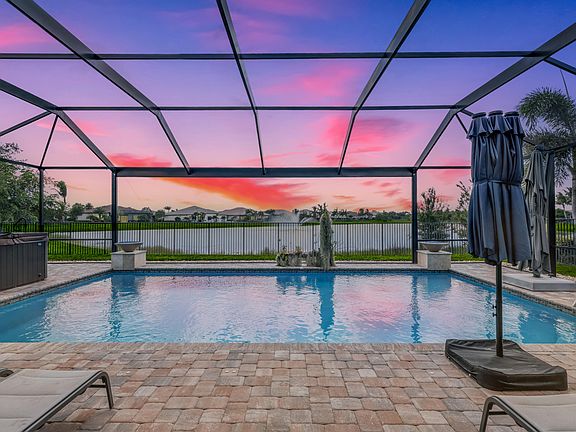 On one of the largest lots in Ancient Tree, this half-acre lakefront home offers wide fountain views and a backyard built for enjoyment. The saltwater heated pool, 6 1/2 feet deep, with fire bowls, hot tub, and panoramic screen enclosure, creates the perfect outdoor retreat. Entertain with ease on the patio featuring a summer kitchen with grill, fridge, ice machine, and trash. Inside, the custom kitchen includes 42'' upper cabinets, upgraded quartz, built-in pet bowls, and premium appliances: Fulgor range with gas burners and double electric ovens, wall oven, microwave, and pot filler. The open great room has coffered ceilings, while the primary suite offers generous closet space. Natural gas serves the dryer, water heater, grill, and burners. Oversized 3-car garage plus golf cart space. Golfers will love being next to Sandhill Crane Golf Club or The Nest, with options for a round on the championship course, the ideal place to practice your short game, or a fun time at the two-story driving range. Enjoy drinks or a meal too. There are new dining and shopping options coming soon for ultimate convenience, including a new Publix. Northlake Boulevard improvements make commuting and errands easy. This property combines outstanding upgrades, a prime location, and a lifestyle that's hard to match in Palm Beach Gardens.