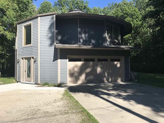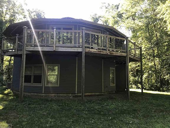 This is an Awesome, Uniquely Designed Tetradecagon Home! If your looking for a peaceful serene setting, look no further!! House sits on just under 2 acres. The First Floor Features your very own Theater Room with sound system and actual Movie Theater Chairs! First Floor also Features a Bedroom with Full Bathroom. Large storage closet and 9 ft. ceilings. Upstairs is absolutely stunning. Cork Floor in the kitchen and Bamboo Flooring in the Dining and Living Room. Custom Kraftmaid Kitchen Cabinets, Duel Fuel Oven. All Stainless Steel Kitchen Appliances stay. Features an Open Floor Plan. Master Bedroom with Beautiful Master Bathroom. Master Bedroom Furniture set is also included in the sale. Large wrap around balcony overlooking the scenic woods!