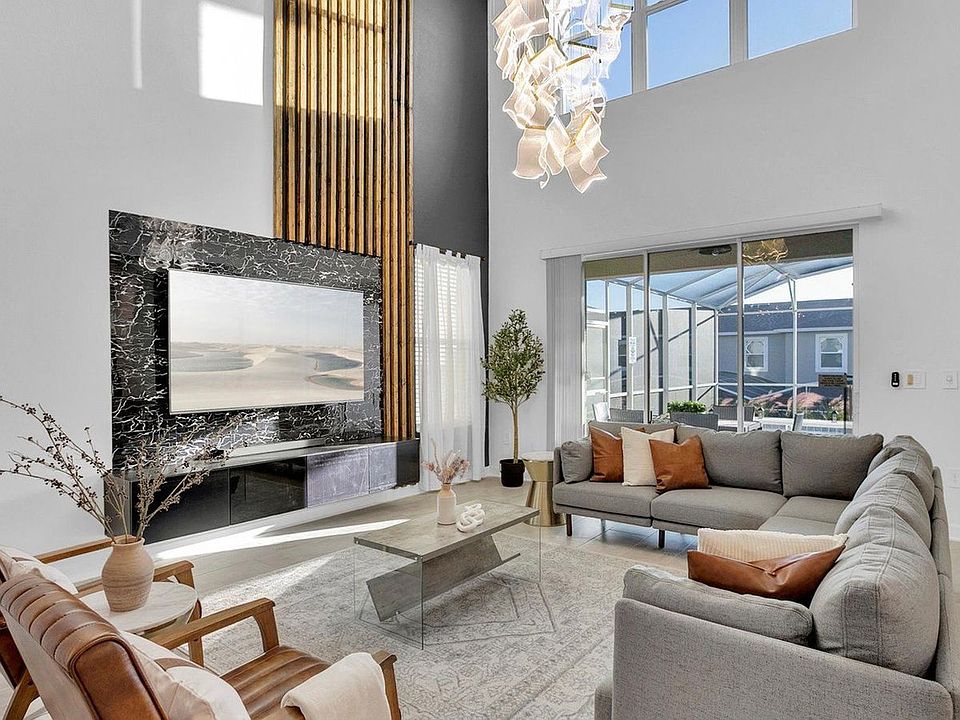 Welcome to this inviting 5-bedroom, 5-bathroom vacation pool home located in the gated community of ChampionsGate Resort. This private retreat offers a spacious and comfortable environment for families, with themed bedrooms and an east-facing private pool with a spa. Situated just 10 miles from Disney World, this home provides a perfect base for exploring Central Florida's attractions. The fully equipped kitchen features seating for 8 at the dining table and 4 at the breakfast counter, making it ideal for family gatherings. The home is thoughtfully designed with themed bedrooms and modern amenities, including Roku TVs in each bedroom for entertainment. The fully equipped kitchen is perfect for preparing meals, and the dining area offers ample seating for family dinners. Relax in the private pool and spa, or enjoy the resort's amenities, including a huge resort-style pool, water slide, lazy river, and more. Optional pool and spa heating is available for an additional charge of $30 per day plus tax. The resort allows a maximum of 5 cars or 3 large passenger vans, with specific parking rules to avoid fines. Additional rental items such as BBQs, cribs, pack-n-plays, strollers, and high chairs are available for rent. Located in the ChampionsGate Resort, this home is just a short distance from popular attractions such as Walt Disney World (10 miles), Universal Studios (21 miles), and SeaWorld (18 miles). The resort offers convenient access to shopping and dining, with Publix Supermarket just 2 miles away and dining options within 2 miles. The Retreat Clubhouse is a 5-minute walk from the property, offering additional amenities for guests to enjoy. The property is smoke-free and pet-free for your comfort. Complimentary Wi-Fi is provided, and towels and linens are included. Guests can enjoy free on-site parking, and there are no resort fees. Check-in is seamless with online email check-in, and 24/7 on-call maintenance is available. The starter welcome packet includes essential items, but guests are responsible for replenishing supplies beyond the initial provision.