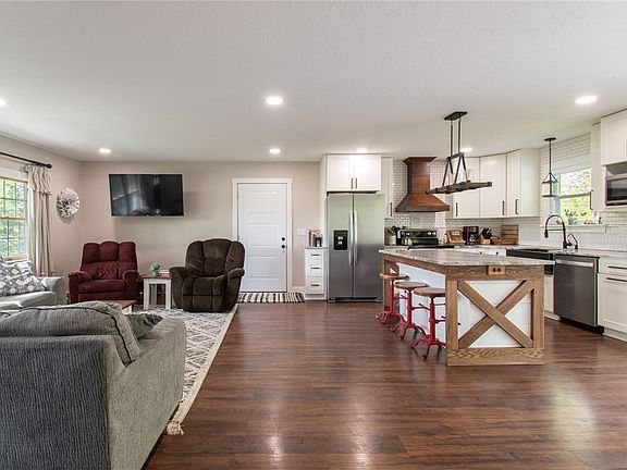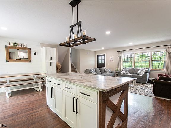 Welcome to this stunning, completely updated, bi-level home located in West Branch local schools that sits on 5-acres. Stepping in the front door, you'll be captivated by the open-concept living/kitchen area. The eat-in kitchen has been completely updated & offers white cabinets, stainless steel appliances, granite countertops, tile backsplash, & center island with breakfast bar. The dining area has a built-in bench seat with a shiplap accent wall & is surrounded by pantry cabinets for extra kitchen storage. A sliding door offers easy access to a huge back deck where you can grill, enjoy the beautiful views, & relax. The second level offers 3 bedrooms with ceiling fans & double-door closets. A trendy full bath with large vanity, double sinks, marble countertops and a shower/tub combo is on the same level. The lower level boasts the master bedroom with a large walk-in closet and & beautiful full bath with tile floor, double sinks, marble countertop, shiplap accent wall, soaker tub, walk