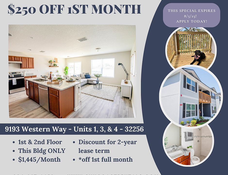 This 1230 square foot apartment home has 2 bedrooms and 2.0 bathrooms. This home is located at 9193 Western Way #3, Jacksonville, FL 32256.