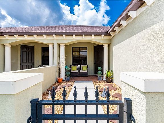 This GORGEOUS Mercedes Villa is a 3 bedroom 2 bathroom 2 car garage Villa that is turn key! Large arched doorways, recessed lighting, security system, luxury vinyl plank flooring, surround sound and more! Huge eat in kitchen with wood cabinetry, stainless steel appliances and plenty of space for entertaining! The large master bedroom has a nice walk-in closet, and an unbelievably LUXURIOUS en-suite with free-standing garden tub and beautifully tilled walk in shower! The guest bedrooms are separated by the guest bathroom with a tub/shower combo. Large screened lanai that overlooks your fenced in back yard and enjoy the most GORGEOUS of sunsets!!! Indoor laundry makes doing chores a breeze! The cute clubhouse, community pool, fitness room, and playground are just seconds up the street!