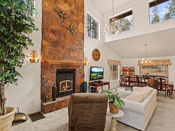 Inside, you'll find an open floor plan with a generous dining area and a spacious loft complete with a kitchenette, ideal for guests, multi-generational living, or a private retreat. The living room showcases a striking floor-to-ceiling fireplace, perfect for cozy mountain evenings.
