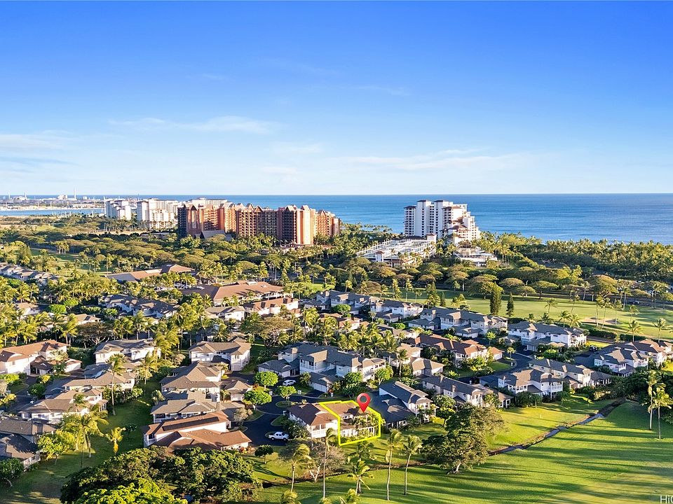 This exquisite Tuberose model fronts the distinguished 12th green and 13th tee off of Ko’Olina Golf Course, a masterpiece designed by Ted Robinson and acclaimed by Golf Digest. With 1,608 square feet of refined luxury living space, this residence offers two bedrooms and two bathrooms. The main level invites you into a sophisticated open floor plan featuring a full bedroom and bath, a modern kitchen, a versatile den/office (potential third bedroom) and a gracious living room. The entire main floor is covered by meticulous marble flooring, plantation shutters on all windows, sub-zero refrigerator and 9'3" ceiling heights. Two (2) covered patios offers sweeping 240 degree golf course views. The upper level houses the luxurious primary suite, complete with dual walk-in closets and a five-piece bath. A convenient two car garage with direct access enhances this elegant lifestyle. This is the first time this unit has been on the market and it is a true gem. Directly outside this gated community are famous restaurants, boutique shops, and world acclaimed resorts. Discover unparalleled elegance in this gated resort neighborhood.