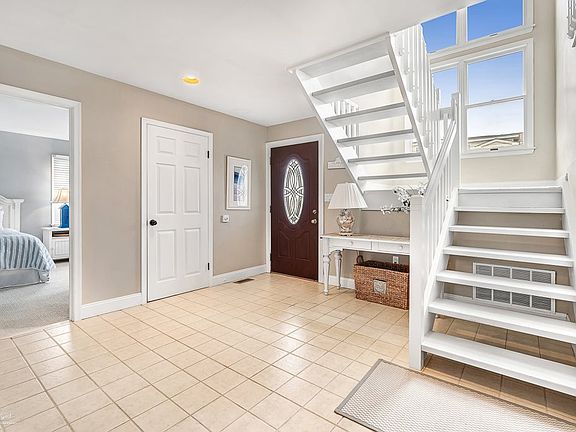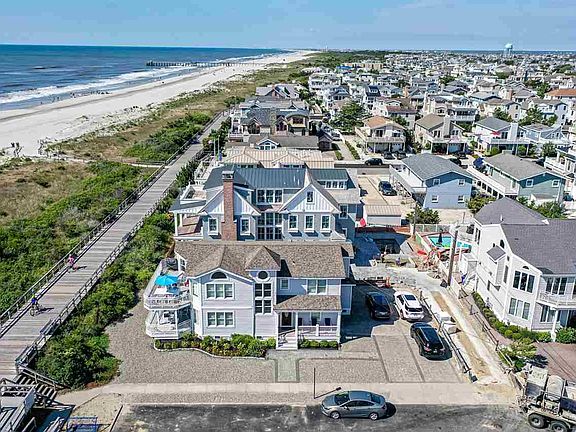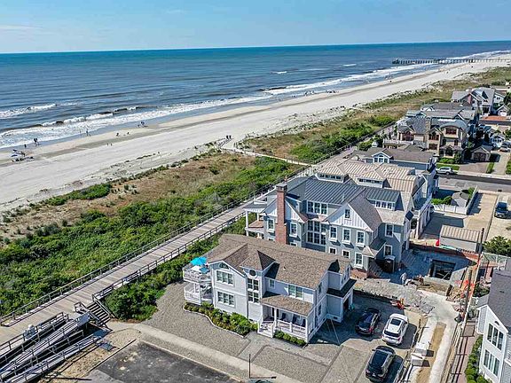 CORNER BEACHFRONT HOME WITH SENSATIONAL BEACH AND CRASHING WAVES VIEWS. The low dune topography behind the boardwalk allows true ocean front views that are becoming more difficult to find due to the build up of the dunes. The home, designed by Oliveri Architects is an attractive two story upside down style with 5 bedrooms and 3.5 baths. There are beautiful new homes being built both next door and behind this home adding value to the block. First floor has a spacious sunlit entry foyer, 3 bedrooms, hall bath and a laundry room. The second floor has a dramatic, vaulted great room, with ample windows allowing fabulous natural light leading out to an expansive sun deck with astounding 180 degree views looking east as well as north and south. Second floor has a wonderful master bedroom with ensuite bath, second bedroom, hall bath and a powder room to serve the great room. The location is prime with easy access to the center of town. The home has recent bathroom upgrades and is attractively furnished.