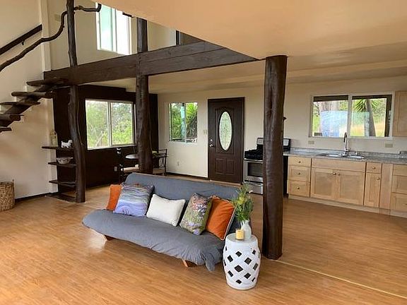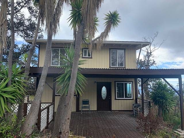 Home with a view for $149,000? Great elevation country setting with a "modern" rustic home is ready for your personal touches. New windows bring all the light in and it has just the right amount of rustic elements. The loft is great for sleeping and large enough for a few beds and a spectacular view through the windows. There are two lanais, one covered and large enough to have a dinning table, or even a fire pit for those evenings of star gazing. Enjoy the beautiful lava features that give the yard a cavernlike feel. This is an established lot with plenty of Hawaiian plants and Ohia trees.