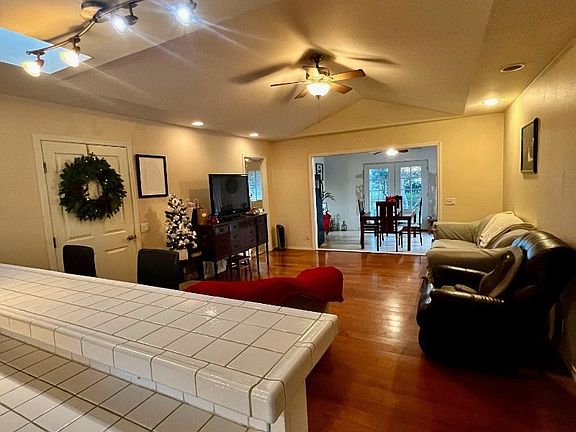 The open living area features beautiful wood flooring, cathedral-style high ceilings, and recessed lighting throughout. The dining room addition has double French doors that lead out to the backyard, with what could be the perfect space for a hot tub. Off the living room, the large primary suite has its own private bath with shower. The two other bedrooms are on the opposite side of the home and well positioned with their own full bathroom. There's also an attached, two car, open garage with its own separate entrance into the living room and a 10,500 gallon water tank with brand NEW pressure tank and water pump.