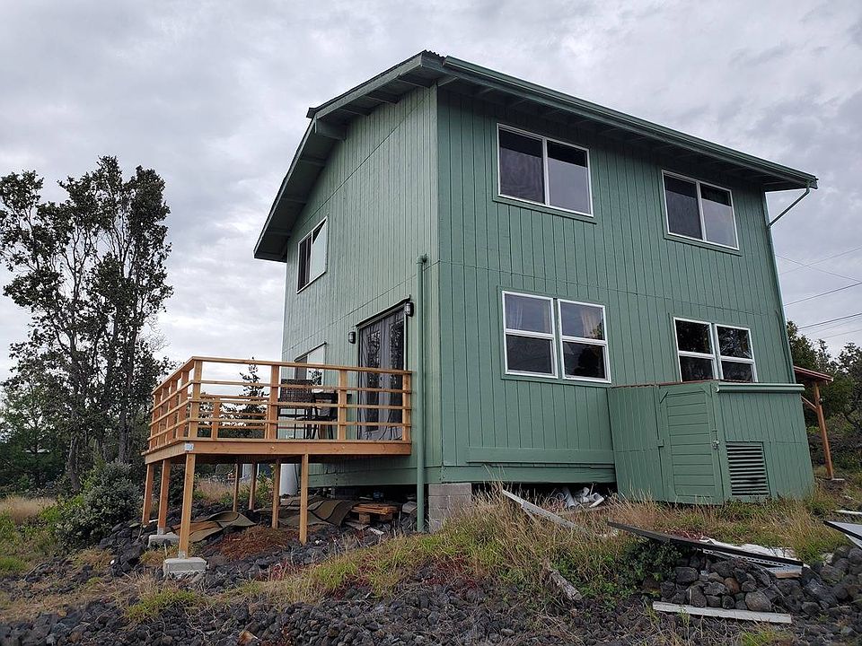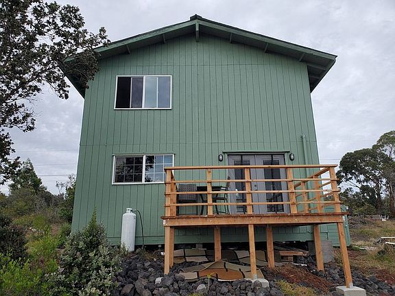 Enjoy all of the space and quiet that Hawaii Ocean View Estates has to offer. This 3 bedroom, 2 bathroom, 1,152 square foot, turnkey, under construction, unfinished, off grid home, is now available and ready to be occupied. The home with a secure driveway gate rests on one acre of partially fenced Agriculture zoned land, and it does not match the tax records. The adjacent 1 acre lot is also included in the sale. On the first floor you’ll find the living room, dining area, kitchen, full bathroom, and the outdoor lanai for the morning coffee and soaking in the view. Upstairs are 3 unfinished bedrooms and one unfinished bathroom. Water is from a catchment system with a large reservoir, pump, 85 gallon pressure tank, and ultra violet filter. A propane tankless water heater provides the hot water for the home. Currently the home is connected to a wastewater composting system. A cesspool is also in place and ready to be connected. Photovoltaic provides the power with an unmounted 7 panel 14 battery storage, power inverter, controller, solar system, with a kill switch. There’s also a gasoline generator for backup power. Power lines are nearby to eventually connect to the grid. The property has fantastic, ocean and sunset views. On clear days you can see South Point and north along the coast. Clear evenings will be bright with the Milky Way Galaxy, constellations, and countless stars. Located at approximately 3800 feet above sea level, the evenings will also be nice and cool. A secure from mongoose chicken coop and outdoor space are available for egg hens to live and thrive. Half of the property is securely fenced to keep unwanted animals out and your pets and livestock safe. Bulldozed and terraced, the property is ready to be set up for growing fruits, vegetables, plants, flowers, coffee, cocoa, etc. All of the extras provided with this property make it easier to follow the off grid lifestyle. For a more modern feel the grid is also available for a connection.
