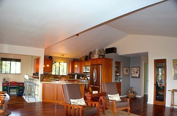 As you enter this Beautiful Home with an open floor plan, you will immediately be AMAZED by the Brazilian hardwood flooring that inspire simple elegance. This 3 Bedroom 2 Bath home exudes pride of ownership with a recently renovated kitchen. There are ample kitchen cabinets, custom made of Cherry wood with stainless steel appliances which include a two door refrigerator and freezer, 5 burner propane stove, and a wine refrigerator. There is a covered wrap around lanai. The catchment tank is 20,000 gallons and there is solar water heating. The roof was replaced approximately 3 years ago. The Master bedroom flooring is handcrafted from Brazilian Teak. The Master Bathroom cabinetry is made of African Mahogany, and finished with a lovely vessel sink. The guest bath cabinetry is also made of African Mahogany with special detail such as shelving. Both bathroom showers are made of slate and coves for your shower needs. The elevation is approximately 2300 ft, perfect for gardening. The land is already planted with avocado, pineapple, persimmon, almond, and mulberry. There is a gardening area. Also on lower side of the property, a chicken coop with approximately 10 happy hens reside. The Sellers say they can stay if you are interested, otherwise they will go to a good home. Did I mention the smoke house? There is much to explore on this one acre property. The Sellers have created walking paths throughout and you could spend hours outside. Enjoy the photos, but they do not do this lovely home and land justice.