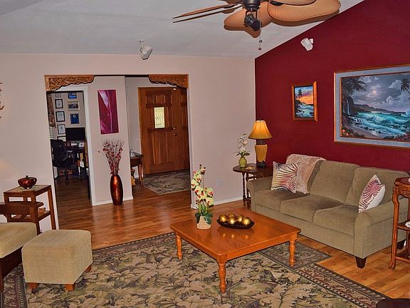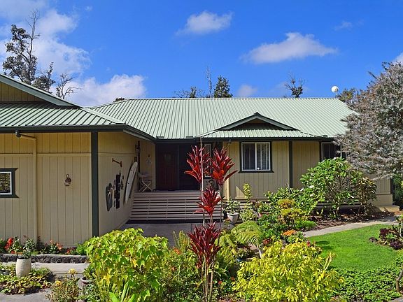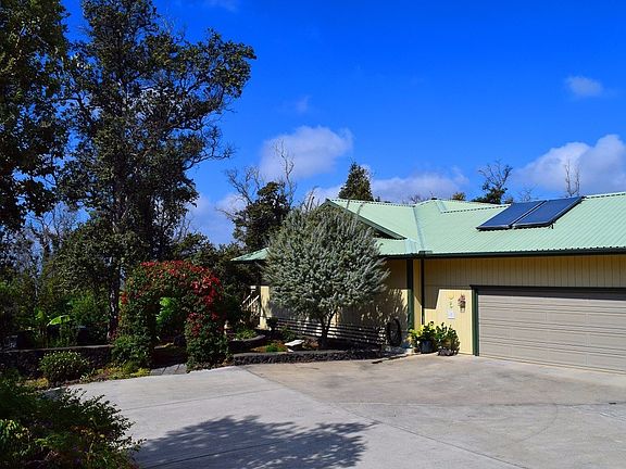 Beautiful, one-of-a-kind, better-than-new, privately gated property. This home was lovingly built and extremely well-cared for - so many extras, so carefully thought out. The spacious 2,100 sf, 3 bdrm/2.5 bath home is open, airy w/quality finishes & sliders leading to over 750 sf of exterior living areas for enjoying the outdoors or soaking in the hot tub under the stars. Cozy up by the gas fireplace on cool evenings. Stroll through & relax in your own 2 acre private botanical garden with paths, benches, bridges, wooden walkways, flowered archways as you enjoy all the lovely trees, plants & flowers. - Dbl front entry wooden doors w/slideaway screens - Excellent floor plan - Separate office/craft room w/built in shelves/desk PLUS a library/game room in addition to the 3 bdrms - Lots of built-in shelves/drawers - Surround sound speakers - Ventless gas fireplace - Built-in entertainment center - Corian countertops & shower surrounds - Laminate/tile floors & warm paint colors throughout - Separate laundry room w/sink - 24 panel Photo Voltaic system-lease paid to 2034 - Solar hot water 119 gal tank - TWO catchment tanks-14,000 & 4,000 gal - High Quality Water filtration systems - Hot tub - Sunsetter awning for lanai - Lg 500+sf garage,350+sf work shed,160 sf covered extra parking - Garden shed/potting area 2500 ft of drip line w/timer - Fenced area perfect for your dog - Security gate w/keypad & remote - Security system in the home - Whirlpool appliances throughout - Lots of pantry/closet/storage space - Extensive rock wall work throughout property - Waterfall feature - Benches, swings, flowered arches, citrus trees - Tree/plant lined asphalt paved driveway w/easy turnabout - Mini-putting green to practice your swing - Excellent elevation-great climate This information herein, while deemed reliable, may contain inaccuracies and is provided w/out warranty or guarantee of any kind