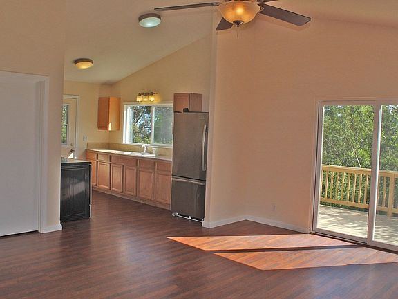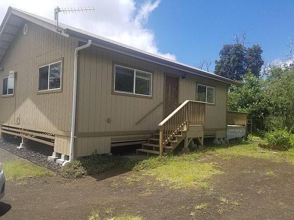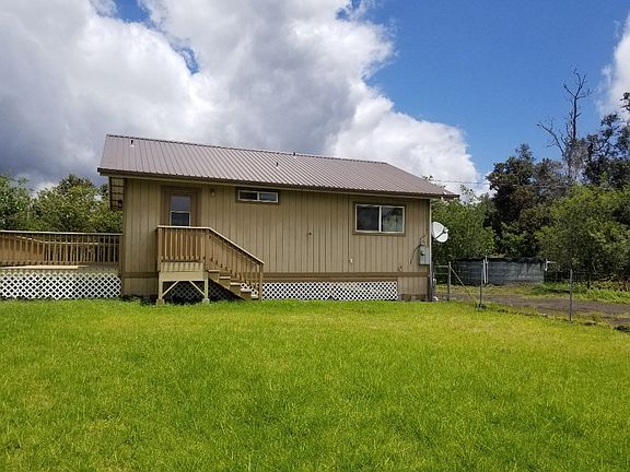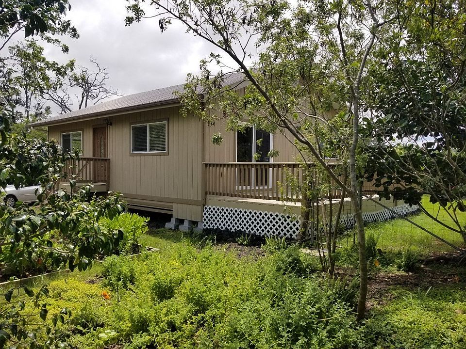 This well-built and immaculate home is set between a forest of old-growth ‘Ohi’a trees and landscaping that includes a dog yard and a shady rockery. The interior of this home is freshly painted, has newly carpeted bedrooms and faux wood laminate flooring in the large living room, kitchen, bathroom, and laundry room. Open and bright ceilings light up the common area, while the lower ceilings in the bedrooms afford generous attic storage. The kitchen has stainless appliances, all-electric, tiled counters, a new sink, and a picture window overlooking some of the tallest Ohi’a trees in Ocean View. Slider patio doors lead to a large 280-square-foot lanai. Large closets, a new large capacity washer & dryer, a new toilet, and a beautiful stone walkway all provide extra value. This home is perfect in every way! Outside features abound. A large fenced-in yard with a grassed lawn will keep your child or dog safe and happy. Veggies, herbs, lilikoi, pineapple, and papaya, are mixed with wild, colorful orchids & carefully selected ornamentals to create easy maintenance, picture-perfect yard. The property’s most outstanding natural feature was created by Goddess Pele from flowing lava about 750 years ago - a colorful lava tube and a thirty-foot-deep trench forested with very old trees. The cave is part of a 66-mile-long cave system that lies beneath much of Ocean View. The owners hope to sell to buyers who will treasure Pele’s gift. You must see this property to appreciate it. This is truly one of a kind offering!