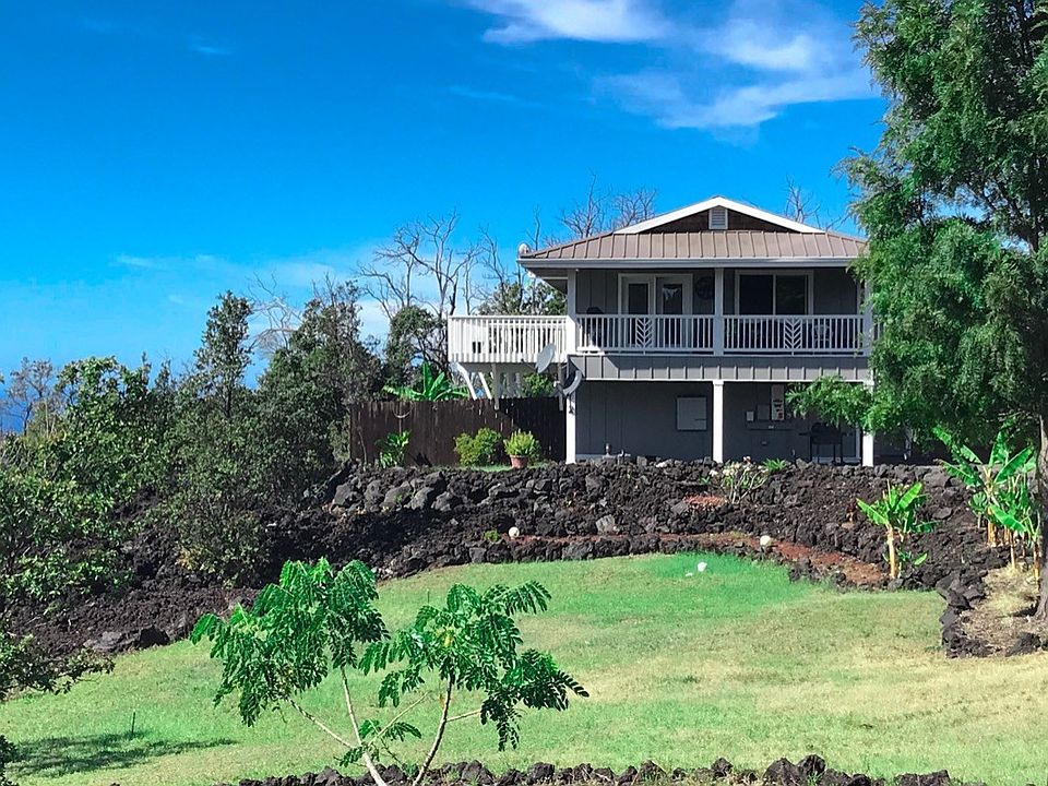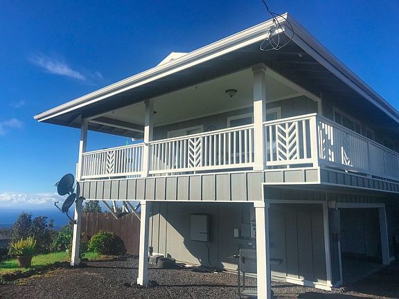 TAKING BACK UP OFFERS NOW!!!!! Want to move right in? This two-story home comes completely furnished including silverware....TVs, furniture, bedding, cabinets, dishes..all of it....excellently maintained 4 bedroom/ 3 bath home in an awesome cooler elevation of Hawaiian Ocean View Estates..Ocean views from most windows! Lovely cool evenings and beautiful sunsets and sunrises. Video security system. Solar power (leased but could purchase) and regular on-grid electric utilities. Washer and dryer included....and all fridges, freezers. All personal items will not be included in sale. Bamboo hard-wood flooring throughout house..with slate in bathrooms. Kitchen includes granite counter tops and island..stainless steel appliances, cherry cabinets, and ocean views out the kitchen window! Most windows upstairs have custom island decorative blinds. BBQ out on the huge lanai. Or play horse shoes out on the landscaped/grassy property...come check out this stunning fully furnished home today! solar panels - 15 panels - currently being leased from Sunrun Inc. Buyers can pick up the lease if they want to (around $130 per month). Panels sell back electricity to electric company and help to offset electric bill. Electric bill normally runs around $60 -$70 a month bamboo hardwood floors throughout the house with slate floors in the bathrooms and tile floor in kitchen. house is being sold completely furnished and move-in ready. septic tank was cleaned out on 17 March 2017. 10,000 gallon catchment system - water is safe to drink new pump - replaced on 14 March 2017 has 1 micron sediment filter and 1 micron carbon filter. has a UV purification filter. company that maintains the system @ $90.00 per month (optional) newly painted inside and outside. extra refrigerator and full upright freezer in garage. washer and dryer in garage also. security system with 4 cameras. can be controlled with your smart phone.