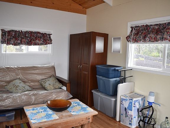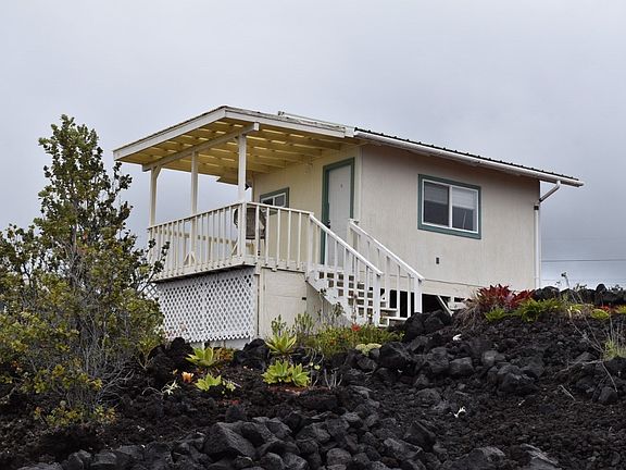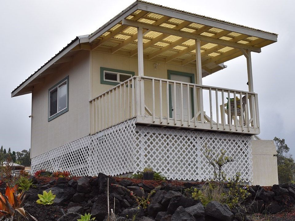 Hawaiian Ocean View Estates - Here's a great place to start life in HOVE with this unpermitted studio cabin on a beautifully planted acre! Extensive leveling of the lot was done years ago with some of the larger ohia trees left in place. The structure measures 12 ft x 16 ft with a storage area underneath. From the lanai and all over the rest of property you'll have a nice ocean view with the windmills at South Point included. Behind the home is a raised, graded building pad area for your future permitted dwelling. No bathroom, septic or water catchment system. Power is on a temporary Helco pole which will be removed post-sale, so solar or wind power will need to be installed. Per Helco, the power is paid in full, so no SSPP assessment is due. Current owners rented a lua and used an outdoor solar shower while they stayed at the cabin in the past. There's a chain at the end of the driveway for some security. Can be almost turnkey with a futon, wardrobe, table and a few other small items that will be included. No staking or survey please as stakes are visible. Lava Zone 2, Flood Zone X.