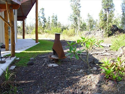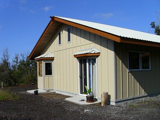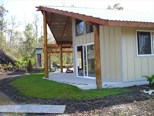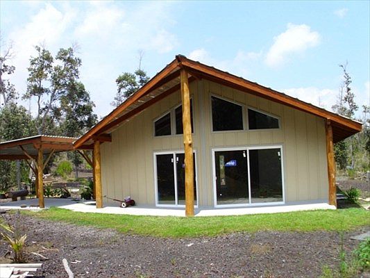 Excellent location just a block & a half off the highway, yet very private. The lot is wide & wooded. This lovely custom home just needs someone to finish it. Two bedrooms, one bath, high ceilings with native Ohia posts& other custom touches. Walls are 9' with 8' doors, the front door is beautiful Mango wood. Exterior doors to both bedrooms, bathroom, kitchen living room & sliders.