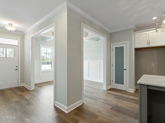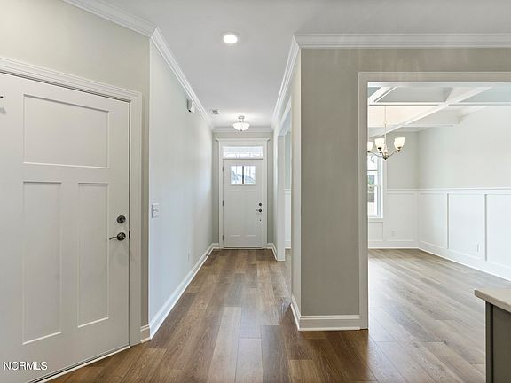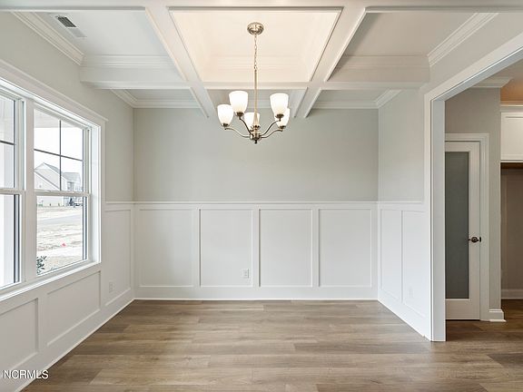 Move-in today! This exquisite home from Hardison Building boasts four bedrooms, three and a half bathrooms, along with a generously proportioned second-floor loft. Spanning 2,400 square feet, this home epitomizes modern elegance. Step inside to discover a stylish dining room adorned with a coffered ceiling, perfect for hosting gatherings. It seamlessly flows into the open kitchen and living area, creating an ideal space for entertaining. The kitchen is a chef's dream, featuring luxurious quartz countertops, gleaming stainless steel appliances, and an oversized island that invites culinary creativity. The first floor is graced by the spacious owner's suite, complete with a tray ceiling. The spa-like bath showcases a fully tiled walk-in shower, double vanities and a generous walk-in closet. Additionally, the convenience of a laundry room on the first floor enhances your everyday living. Ascending to the second floor, you'll find three more bedrooms, two well-appointed bathrooms, and a versatile loft area, perfect for relaxation or recreation. Step outside to your spacious cover porch to enjoy your large private partially fenced yard. The sodded and irrigated yard provides a lush backdrop for outdoor enjoyment. This home boasts an array of desirable features that will elevate your living experience. Revel in the beauty of wide plank laminate flooring that graces the entire first-floor living area. Cozy up by the fireplace on chilly evenings, relish in the convenience of a gas range, and admire the elegant wood stair treads. Plus, enjoy the efficiency of a natural gas hot water heater. The Sanctuary at Forest Sound is strategically located in the heart of Hampstead, offering easy access to a host of amenities. Within a mere 15-minute drive, you can reach the vibrant city of Wilmington or the sandy shores of Surf City/Topsail. Moreover, you'll find yourself just one mile from the Intracoastal Waterway, a paradise for a boaters