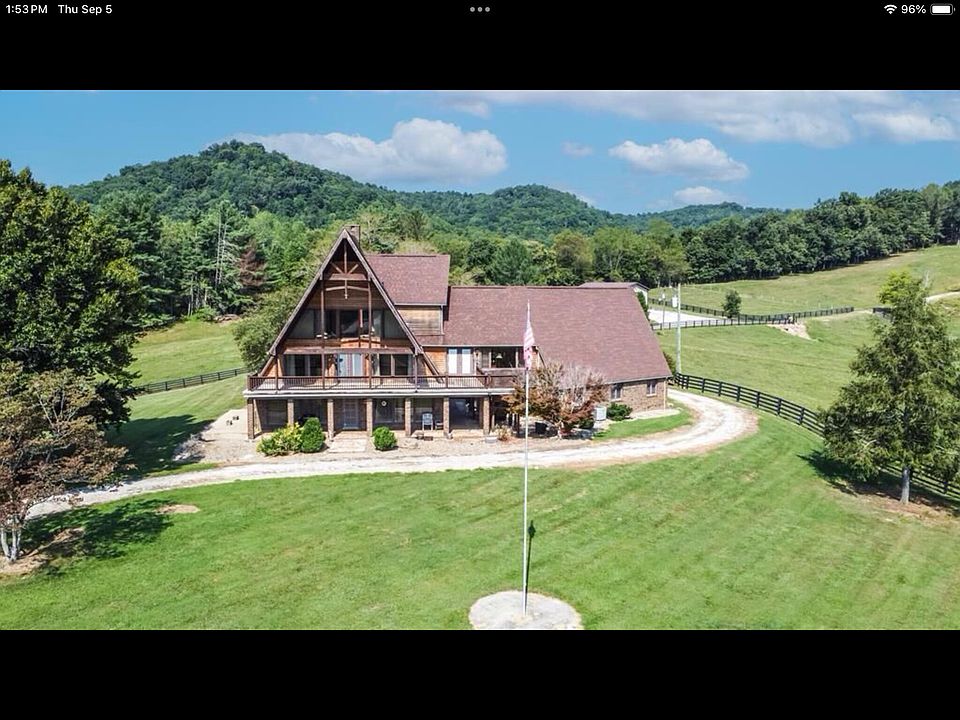 Convenience and privacy. Incredibly spacious, three level brick A-frame style home situated to maximize scenic views. Over 5000 sq ft. offering 5 bedrooms 4.5 bathrooms and 2 kitchens with attached 3 car garage. Each floor has 2sets of stairs for easy access. You will approach your stately residence on the hill by a gated entrance and lengthy paved driveway. Ample parking. Home nestled on 50.5 surveyed acres, approx 30 acres cleared with wood rail plank fencing. Presently utilized for cattle, Good ground, will support 15 cows with calves. 2600 sq ft. metal sided pole barn with concrete floors, electric, high bay, including an adjoining bonus area, possible guest house quarters with full bath. Two additional barns for livestock and storage. 20 minutes to Maysville Ky 1.5 hrs to Lexington or Cincinnati