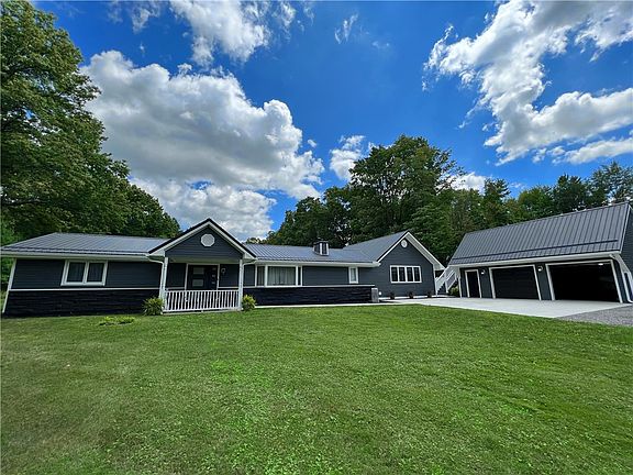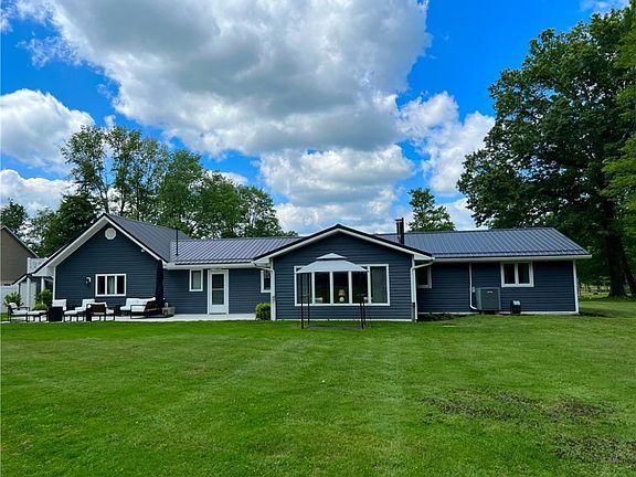 Sprawling Ranch situated on over 3 acres. This completely redone contemporary has it all! Walk through the front door into the spacious living room with fireplace and large window for an abundance of light. Kitchen with granite counters and stainless-steel appliances. Dining area leads into all season's room with tongue and groove walls and ceiling with skylight and wet bar. Split bedroom plan with master bedroom and bath on one end and the other two bedroom and bath on the other. Large immaculate garage with a 30x9 man cave above. Large concrete patio overlooking the backyard. This home is a one of a kind with a lot to offer! Large addition pole building at back of property for great storage and all your toys.