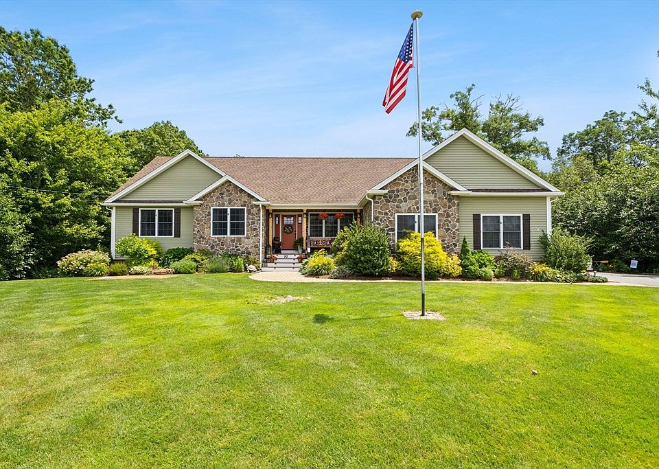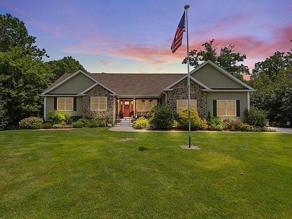 Discover this stunning Executive Ranch on 1.64 acres tucked away on a secluded dead-end street, featuring striking stone veneer siding and a welcoming covered front porch. Step inside to an open layout with hardwood floors throughout, ideal for entertaining. The living room boasts a cozy propane fireplace with stone surround and French doors leading to a spacious screened-in porch. This home offers 3-4 bedrooms, including a primary suite with an on-suite bath and walk-in closet. Enjoy central air, beautifully landscaped grounds, a private yard with an above-ground pool, multi-level composite decks, and a partially finished basement with French door access. Additional features include an oversized 2-stall garage, Navien tankless hot water, irrigation system, and backup generator switch.