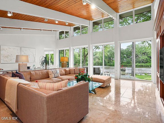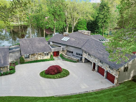 Extraordinary 5.63 acre private oasis boasts sundrenched 6 bedroom Contemporary built in Frank Lloyd Wright style overlooking tranquil pond, ideal for fishing and non-motorized boating. With pool, tennis court, putting green and apartment. Showcases water views from walls of windows, doors in most rooms, vaulted ceilings, 2019 chef's kitchen with fireplace, newly painted interior and 2020 roof. Features stunning wood cabinetry in family room, expansive dining room open to great room with stone fireplace, screened-in porch and glass/stone studio. Offers main level master suite with his/her baths, sitting room with stone patio; three bedrooms and full bath. Second floor affords sweeping views of property; second master suite with den, deck, fireplace, baths, walk-in closets and bedroom.