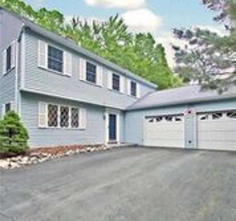 Salt Box colonial with vinyl siding and upstairs bonus room/dormer on 10 1/2 wooded acres with a stream.
